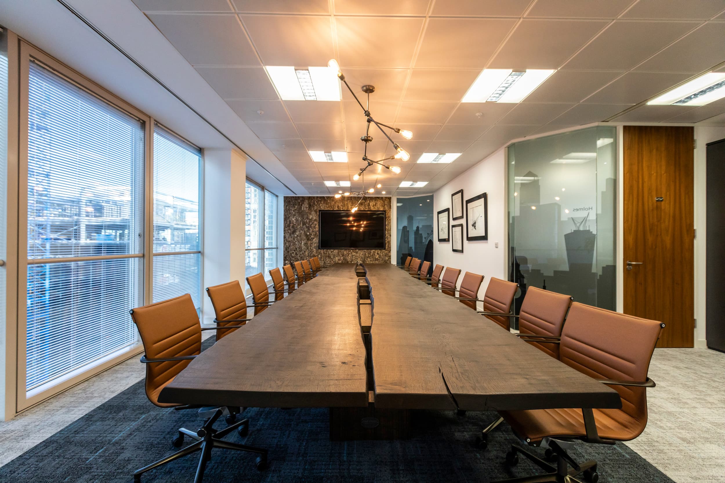 By altering the layout of the existing partitions, we created one large room to fit a 7 metre long tailormade boardroom table, as well as a small breakout area where drinks and light refreshments could be prepared and served.
