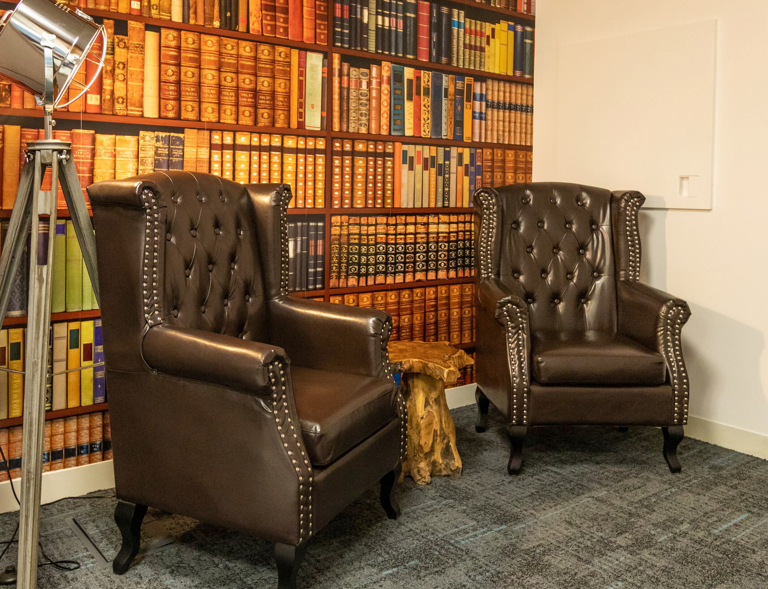 We also allocated space just outside the comms room to provide a quiet area for people to sit and read. To define and create a club feel to the space, we fitted bright library shelving effect wall vinyl and high back leather chairs.
